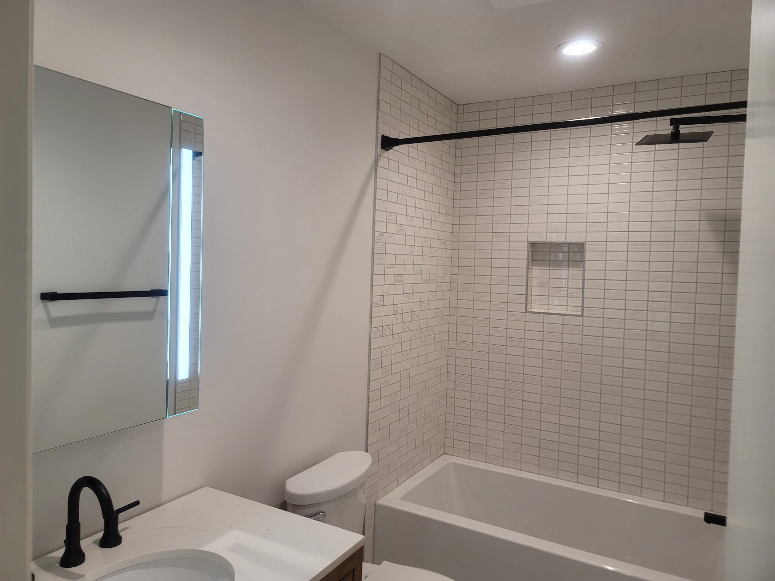 - Project Goals/Project Outline: Studio Cue was engaged by the client to modernize and open up their townhouse space. They took the space down to the studs, enlarging the kitchen and upstairs bathrooms. Maximizing critical function areas and enlivening the entire home with classic modern finishes. Studio Cue worked as their architect, interior designer and construction project manager to create a modern, open concept and functional layout.